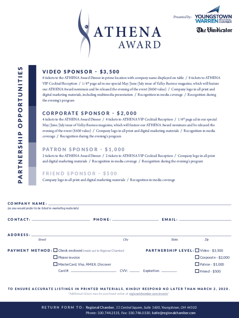 Presented by:AT H E NA AWA RD VIDEO SPONSOR $3,500 8 tickets to the ATHENA Award Dinner in prime location with company name displayed on table / 8 tickets to ATHENA VIP Cocktail Reception / 1/4th