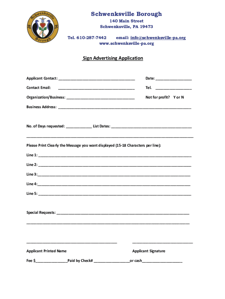 Shanksville Borough 140 Main Street Shanksville, PA 19473 Tel. 6102877442 email: info schwenksvillepa.org www.schwenksvillepa.orgSign Advertising ApplicationApplicant Contact: Date: Contact Email:Tel.