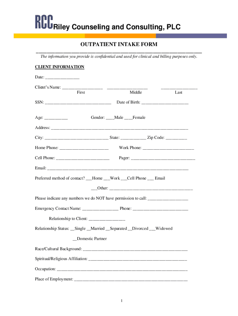 Riley Counseling and Consulting, PLC OUTPATIENT INTAKE From The information you provide is confidential and used for clinical and billing purposes only. CLIENT INFORMATION Date: Clients Name: First
