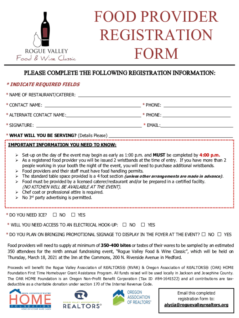 FOOD PROVIDER REGISTRATION FORM PLEASE COMPLETE THE FOLLOWING REGISTRATION INFORMATION: * INDICATE REQUIRED FIELDS * NAME OF RESTAURANT/CATERER: * CONTACT NAME: * PHONE: * ALTERNATE CONTACT NAME:
