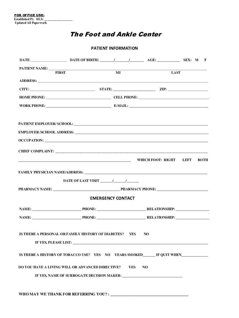FOR OFFICE USE: Established Pt. DLS: Updated All Paperwork Foot and Ankle Center PATIENT INFORMATION DATE: DATE OF BIRTH: / / AGE: SEX: PATIENT NAME: FIRST MI LAST ADDRESS: CITY: STATE: ZIP: HOME
