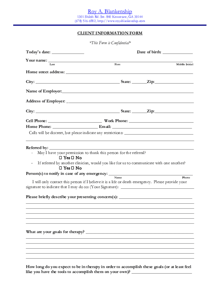 Roy A. Blankenship1301 Shiloh Rd. Ste. 840 Kennesaw, GA 30144 (678) 5166902; http://www.royablankenship.comCLIENT INFORMATION FORM *This Form is Confidential* Today's date: Date of birth: Your name: