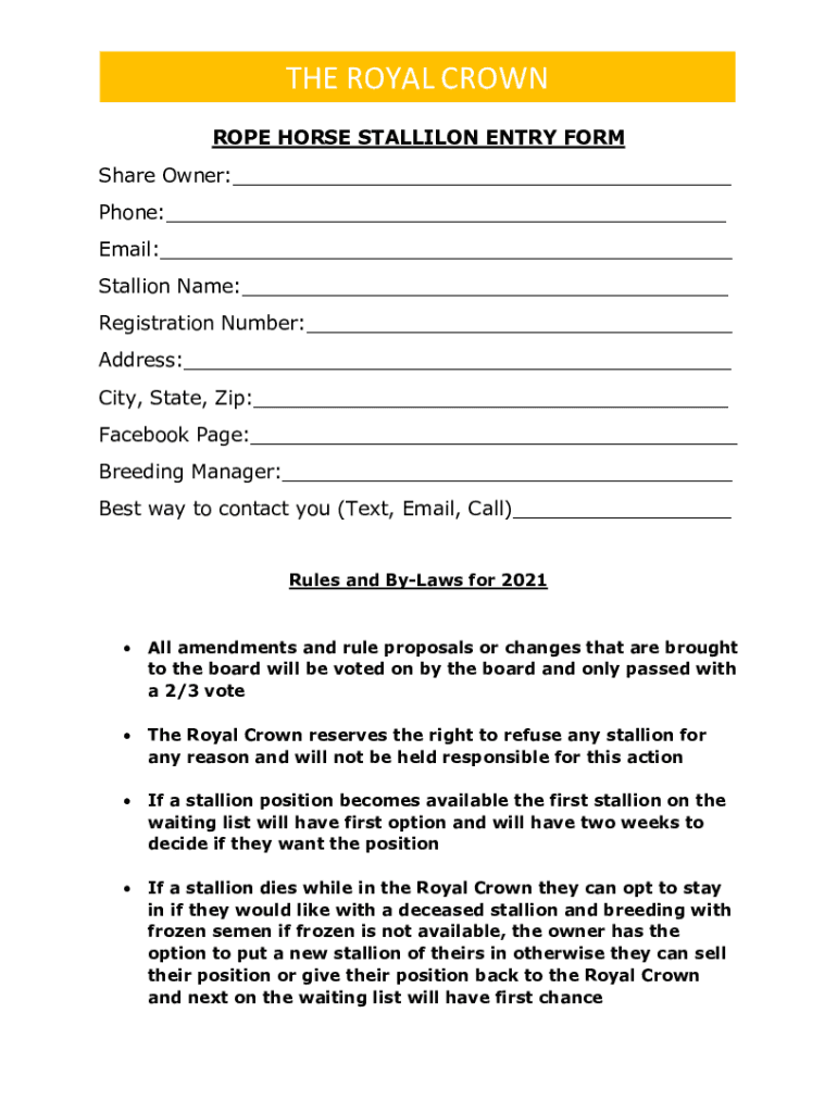 THE ROYAL CROWN ROPE HORSE STALLION ENTRY FORM Share Owner: Phone: Email: Stallion Name: Registration Number: Address: City, State, Zip: Facebook Page: Breeding Manager: the Best way to contact you