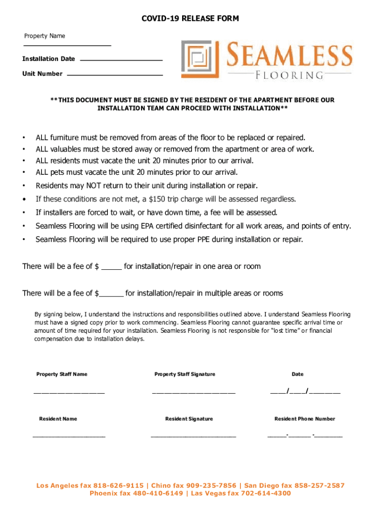 COVID-19 RELEASE FORM Property Name Installation Date Unit Number**THIS DOCUMENT MUST BE SIGNED BY THE RESIDENT OF THE APARTMENT BEFORE OUR INSTALLATION TEAM CAN PROCEED WITH INSTALLATION** ALL furniture