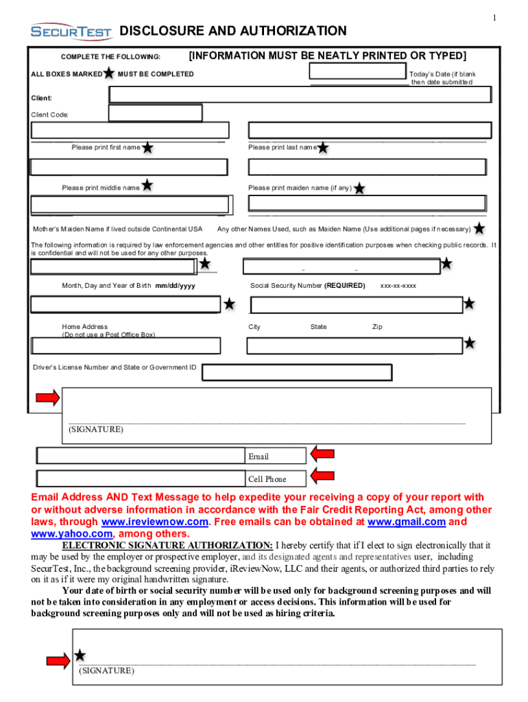 1DISCLOSURE AND AUTHORIZATION COMPLETE THE FOLLOWING: ALL BOXES MARKED INFORMATION MUST BE NEATLY PRINTED OR TYPED MUST BE COMPLETEDTodays Date (if blank then date submittedClient: Client Code: Please