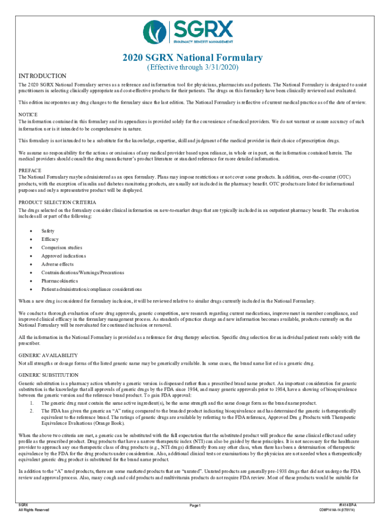 INTRODUCTION(Effective through 3/31/2020)The 2020 SGR National Formulary serves as a reference and information tool for physicians, pharmacists and patients. The National