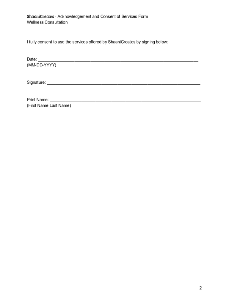ShaaniCreates Acknowledgement and Consent of Services Form Wellness ConsultationCONFIDENTIALITY CLIENT RIGHTS Your experiences during our sessions are confidential, and you have a right to view your