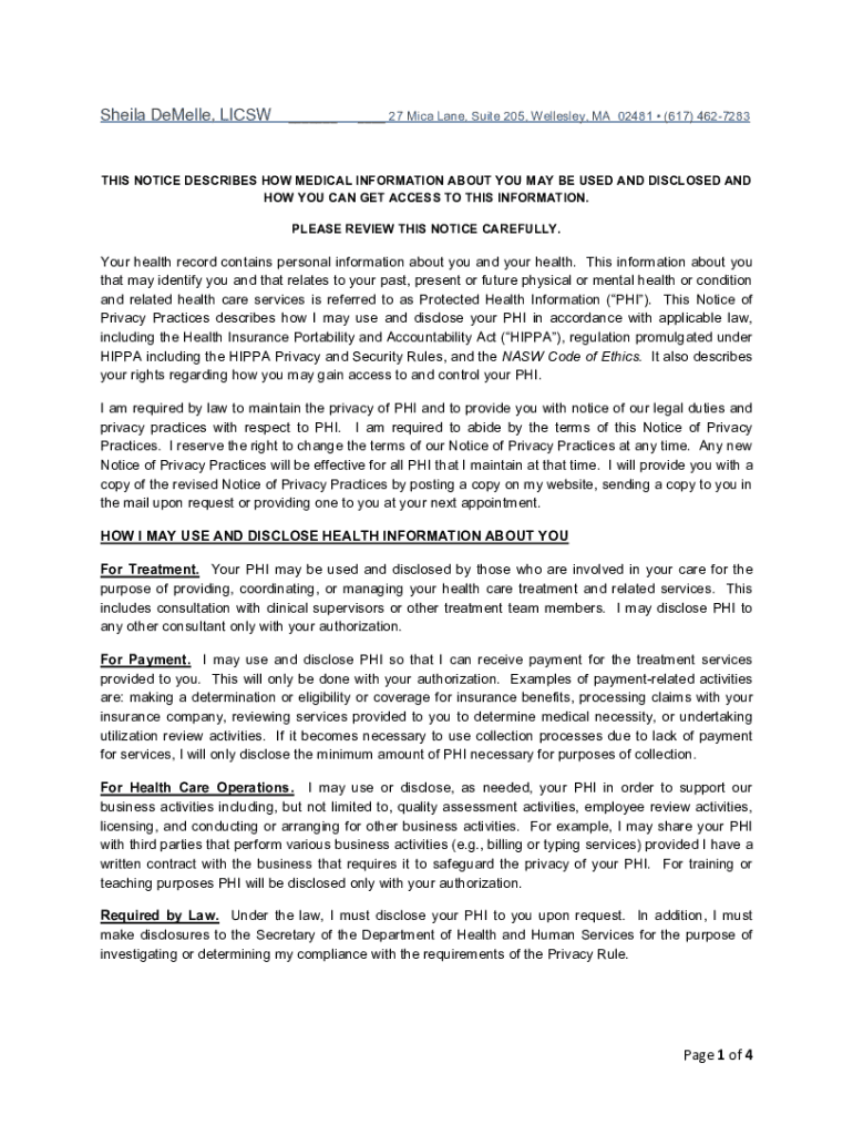 Sheila Demesne, LCSW 27 Mica Lane, Suite 205, Wellesley, MA 02481 (617) 4627283THIS NOTICE DESCRIBES HOW MEDICAL INFORMATION ABOUT YOU MAY BE USED AND DISCLOSED AND HOW YOU CAN GET ACCESS TO THIS