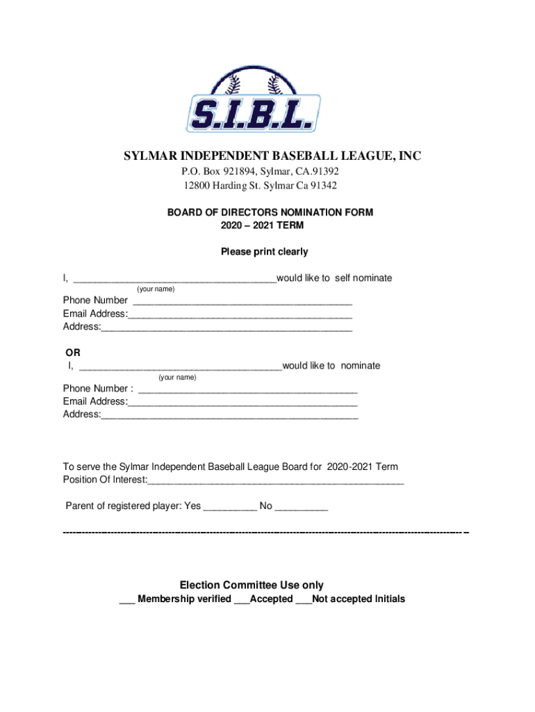 SYL MAR INDEPENDENT BASEBALL LEAGUE, INC P.O. Box 921894, Solar, CA.91392 12800 Harding St. Solar Ca 91342 BOARD OF DIRECTORS NOMINATION FORM 2020 2021 TERM Please print clearly I, would like to self