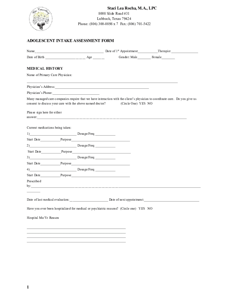 Staci Lea Rocha, M.A., LPC8008 Slide Road #31 Lubbock, Texas 79424 Phone: (806) 3000898 × 7 Fax: (806) 7015422ADOLESCENT INTAKE ASSESSMENT FORM Name Date of 1st Appointment Therapist Date of Birth