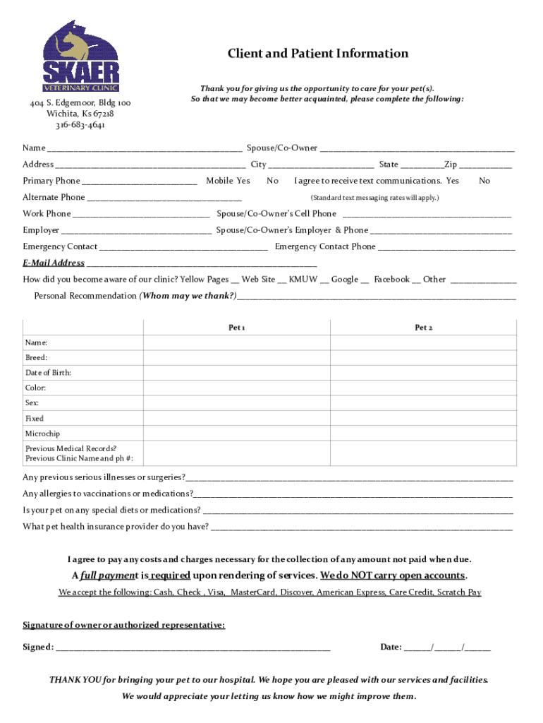 Get the free Client and Patient Information Form - Skaer Veterinary Clinic