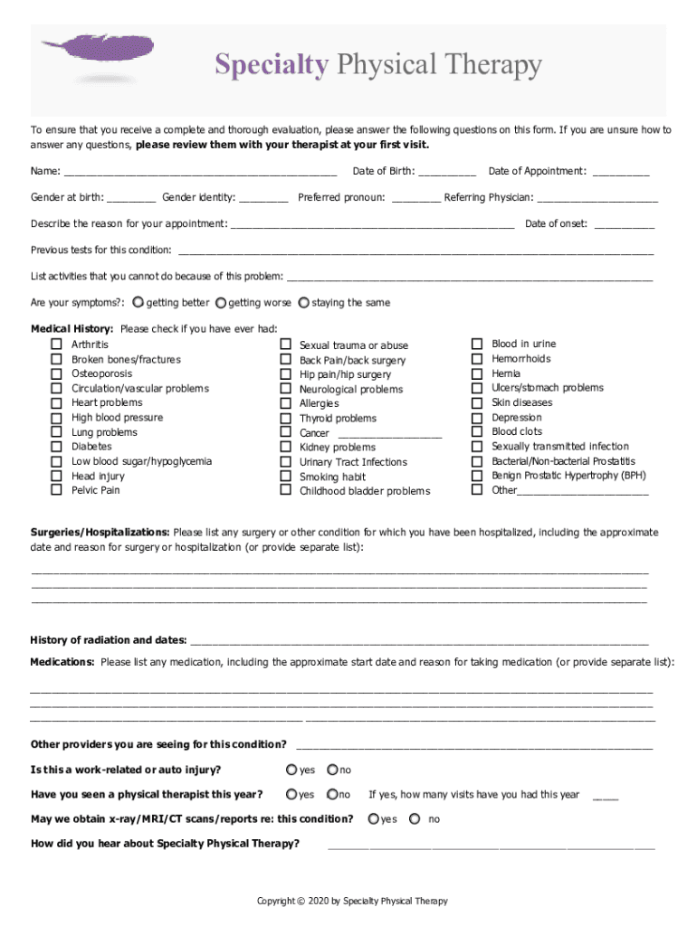 Specialty Physical Therapy To ensure that you receive a complete and thorough evaluation, please answer the following questions on this form. If you are unsure how to answer any questions, please