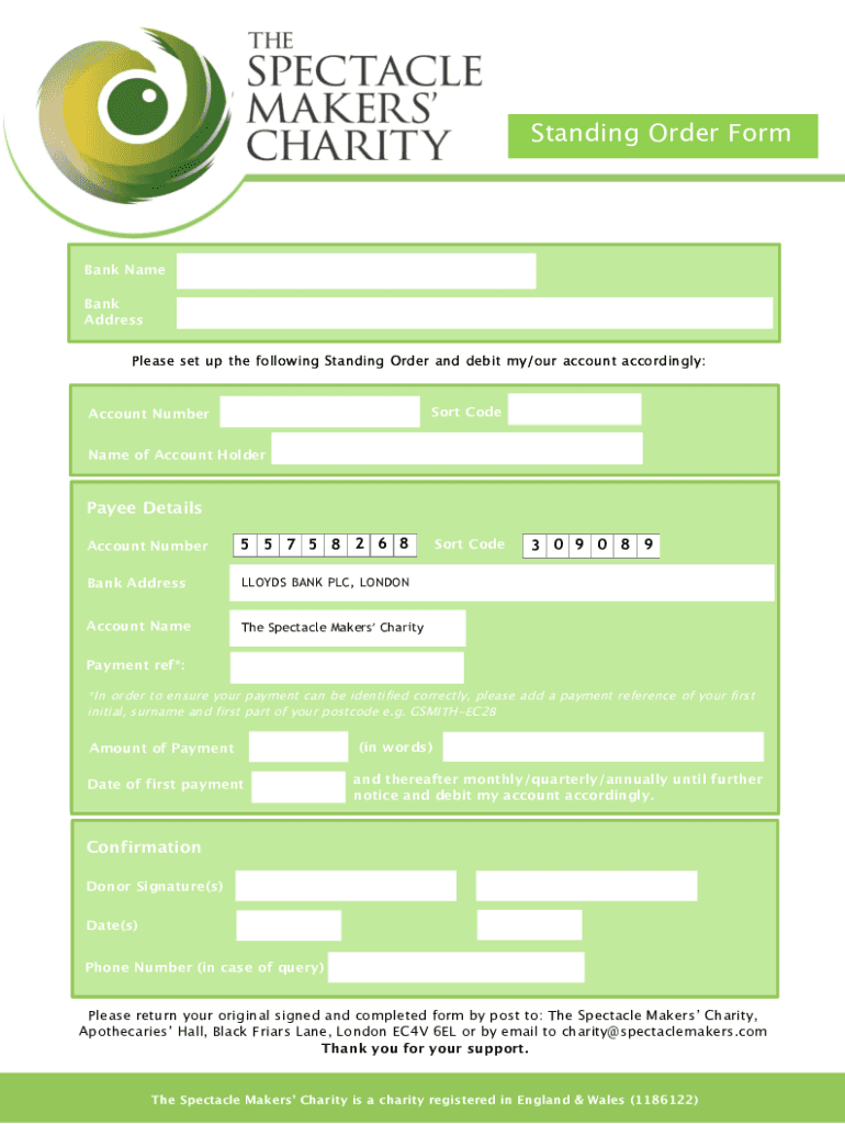 The new standing order form is a document used to set up a regular payment from your bank account to another account.