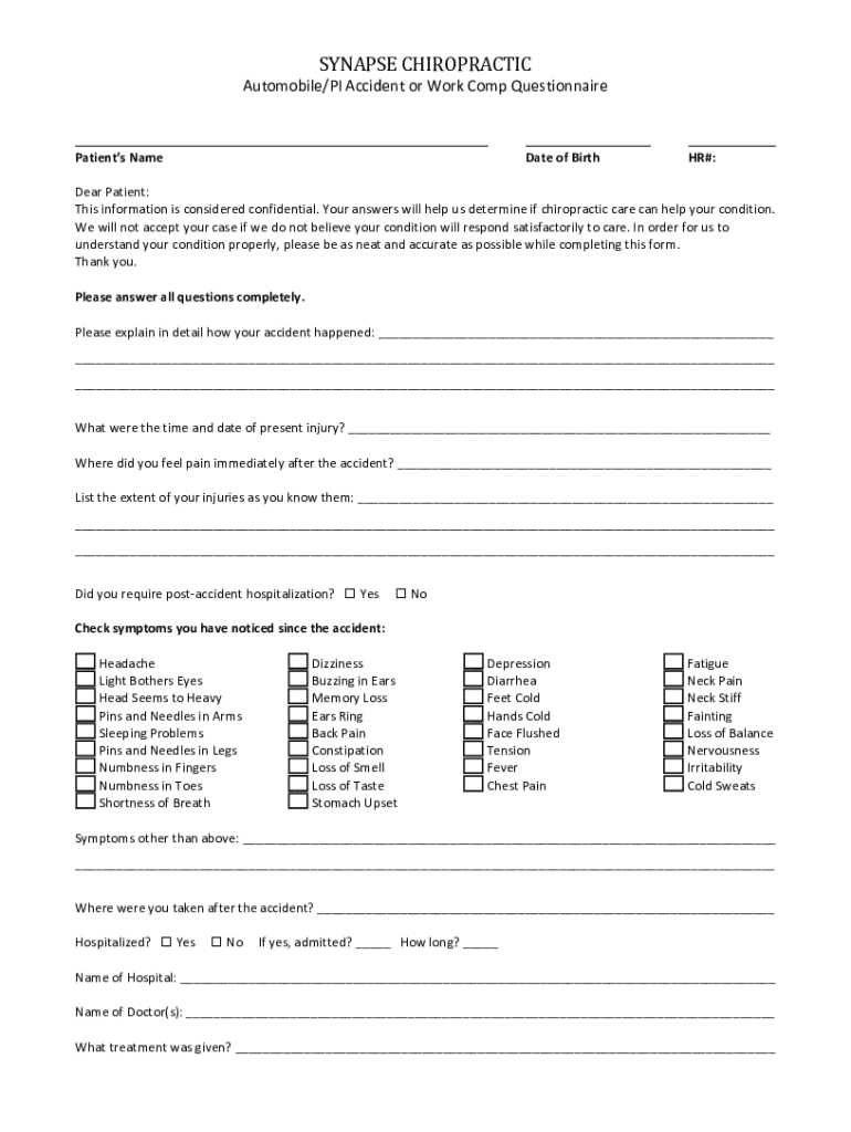 SYNAPSE CHIROPRACTICAutomobile/PI Accident or Work Comp QuestionnairePatients Name Date of Birther#:Dear Patient: