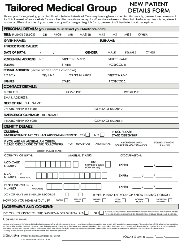 Gather all the necessary information that needs to be included in the form, such as the patient's full name, contact details, and medical history.