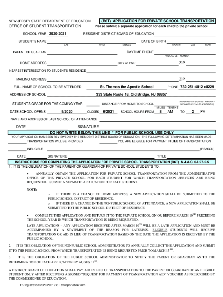(B6T) APPLICATION FOR PRIVATE SCHOOL TRANSPORTATION JERSEY STATE DEPARTMENT OF EDUCATIONOFFICE OF STUDENT TRANSPORTATION