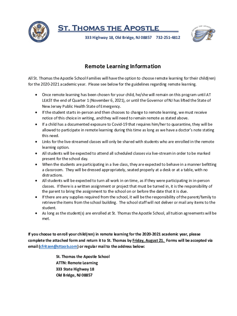 St. Thomas the Apostle 333 Highway 18, Old Bridge, NJ 08857 7322514812Remote Learning Information All St. Thomas the Apostle School Families will have the option to choose remote learning for their