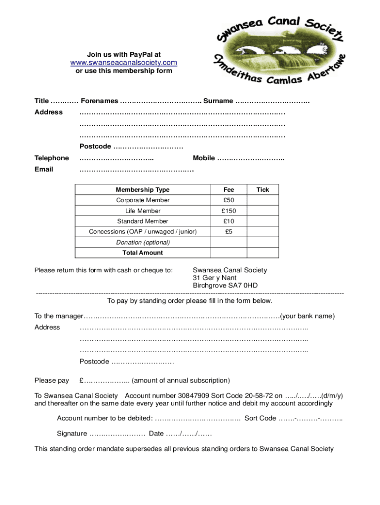 Join us with PayPal ATGW.swanseacanalsociety.com or use this membership fertile Forenames. Surname. Address. . . Postcode Telephone.