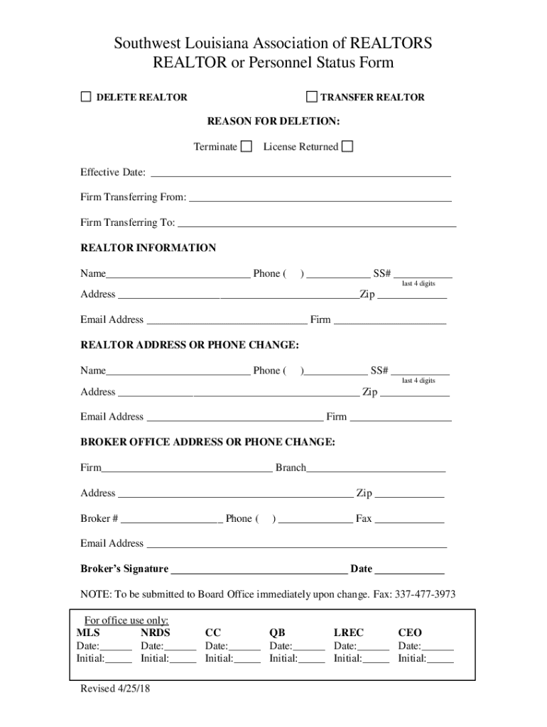 Southwest Louisiana Association of REALTORS REALTOR or Personnel Status Form DELETE REALTORTRANSFER REALTORREASON FOR DELETION: TerminateLicense ReturnedEffective Date: Firm Transferring From: Firm