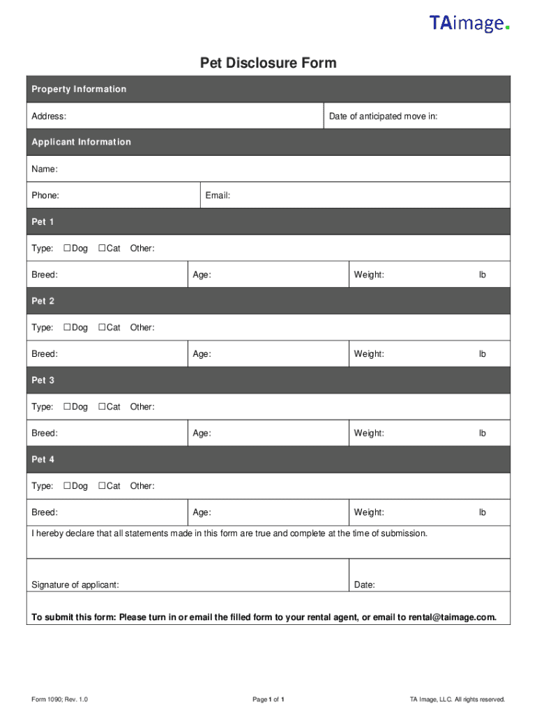 The purpose of the pet disclosure form is to ensure landlords are aware of pets kept on their property and to establish rules and guidelines for pet ownership.