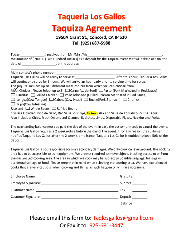 1950A Grant St., Concord, CA 94520 Tel: (925) 6875988 Today, I received from Mr./Mrs./Ms, the amount of $200.00 (Two Hundred Dollars) as a deposit for the Aquila event that will take place on the