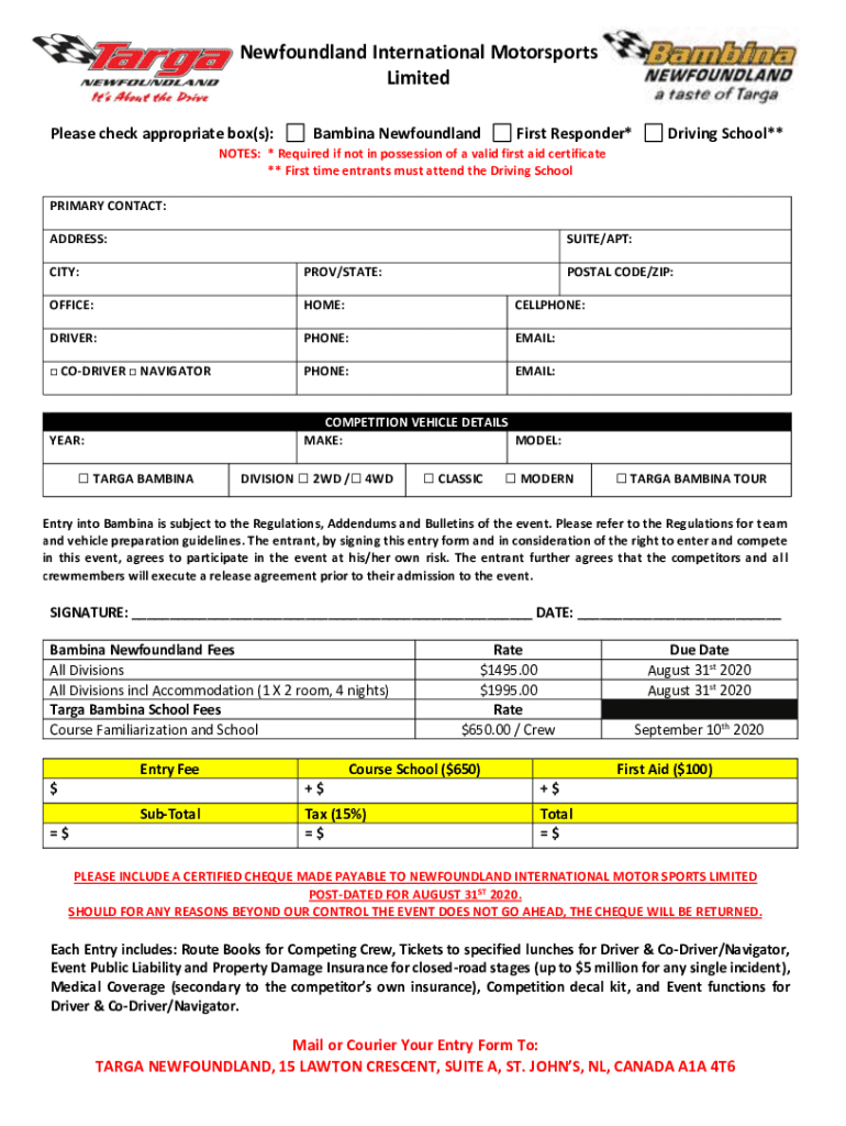 Newfoundland International Motorsports Limited Please check appropriate box(s):Entry Form Part 1 Bombing NewfoundlandFirst Responder×Driving School**NOTES: * Required if not in possession of a valid