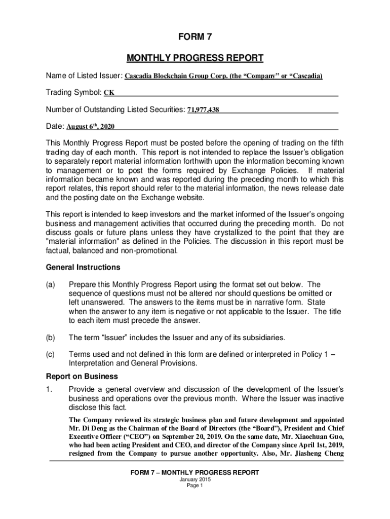 Name of Listed Issuer: Cascadia Blockchain Group Corp. (the Company or Cascadia)
