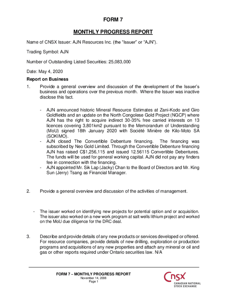 Name of CNS Issuer: AJN Resources Inc. (the Issuer or AJN).