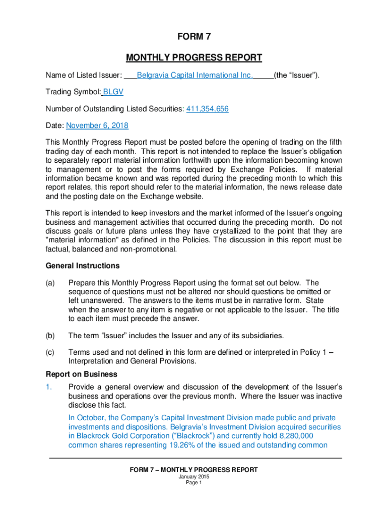 Name of Listed Issuer:Belgrade Capital International Inc.(the Issuer). Trading Symbol: BGV