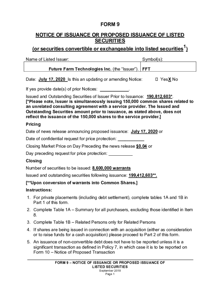 FORM 9 NOTICE OF ISSUANCE OR PROPOSED ISSUANCE OF LISTED SECURITIES(or securities convertible or exchangeable into listed securities1) Name of Listed Issuer:Symbol(s):Future Farm Technologies Inc.