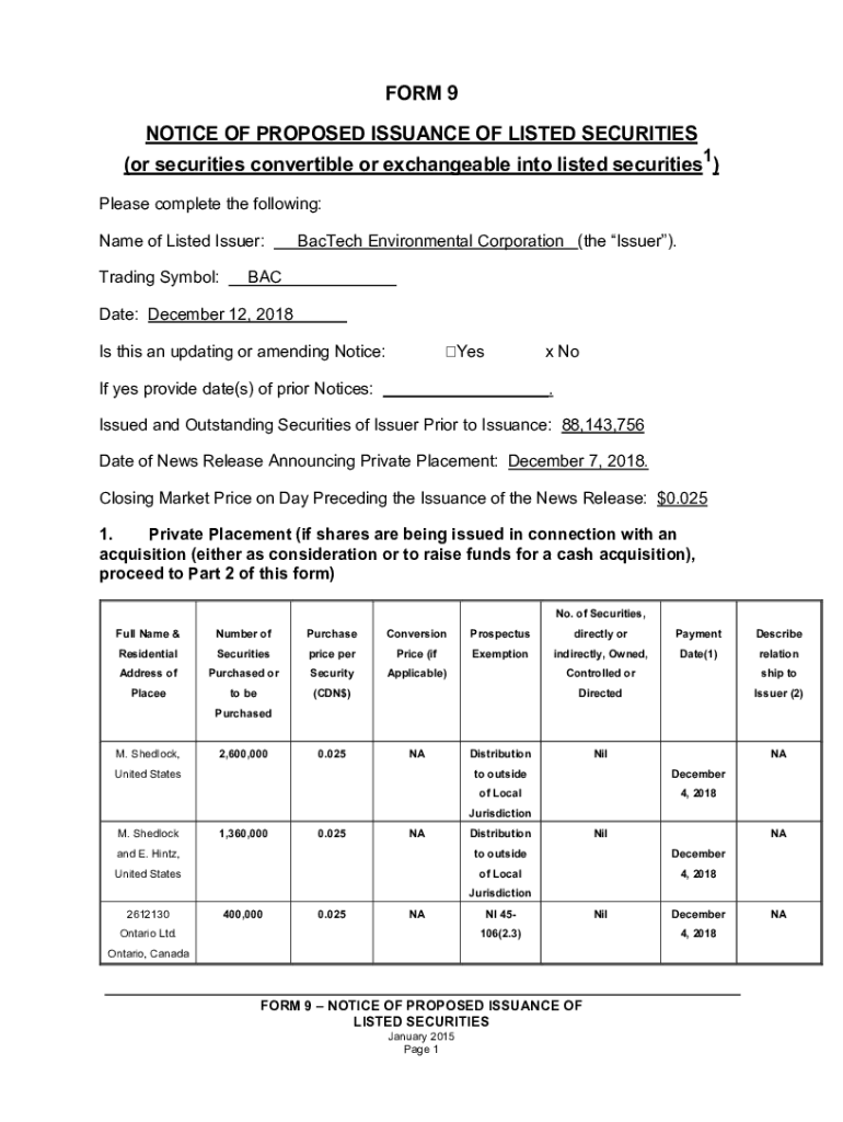 FORM 9 NOTICE OF PROPOSED ISSUANCE OF LISTED SECURITIES(or securities convertible or exchangeable into listed securities1) Please complete the following: Name of Listed Issuer: Trading Symbol:Batch