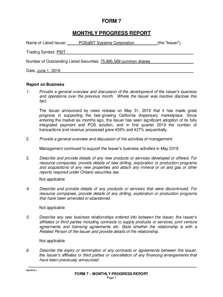 This document reports on the monthly progress and business activities of POSaBIT Systems Corporation, including developments in operations, management activities, financial details, and compliance