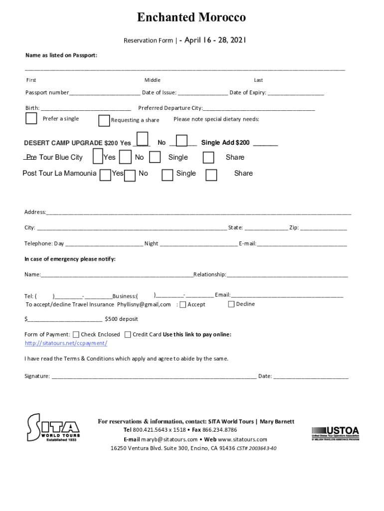 Enchanted Morocco Reservation Form April 16 28, 2021 Name as listed on Passport: FirstMiddleLastPassport number Date of Issue: Date of Expiry: Birth: Prefer a singlePreferred Departure City: Requesting