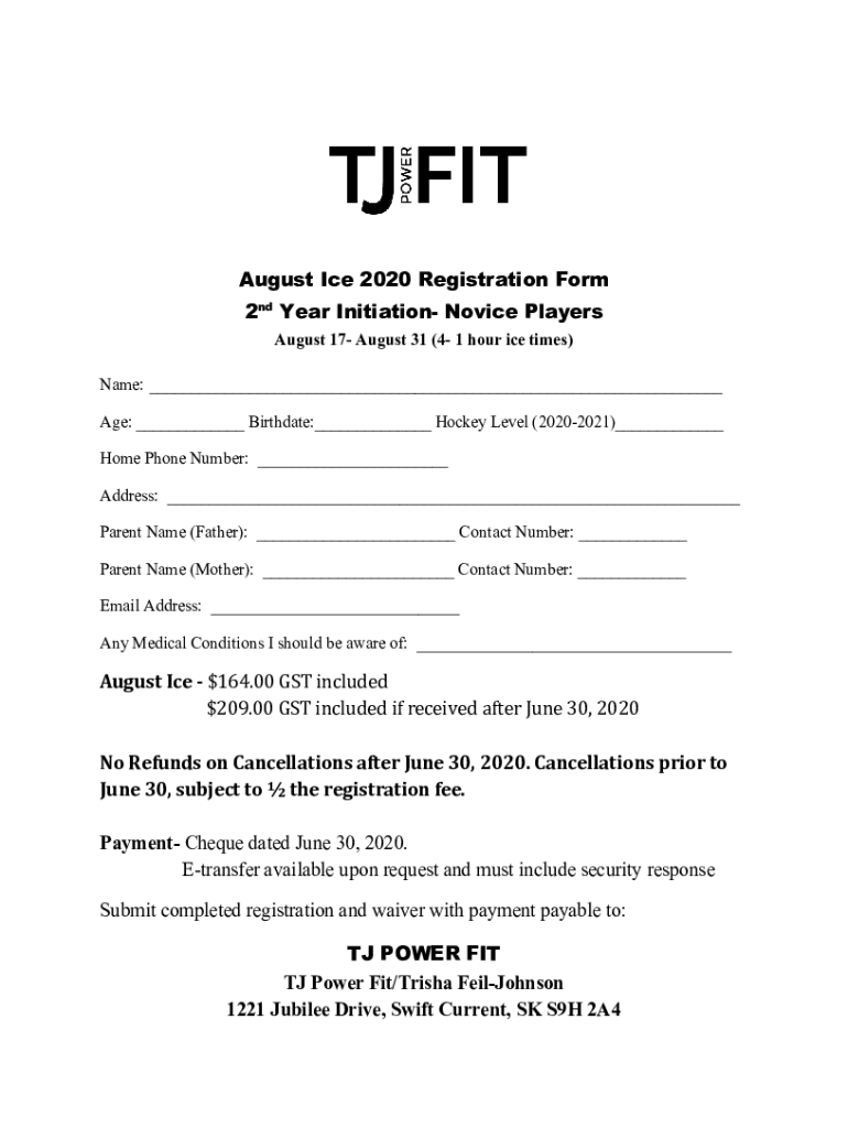 August Ice 2020 Registration Form 2nd Year Initiation Novice Players August 17 August 31 (4 1 hour ice times) Name: Age: Birthdate: Hockey Level (20202021) Home Phone Number: Address: Parent Name