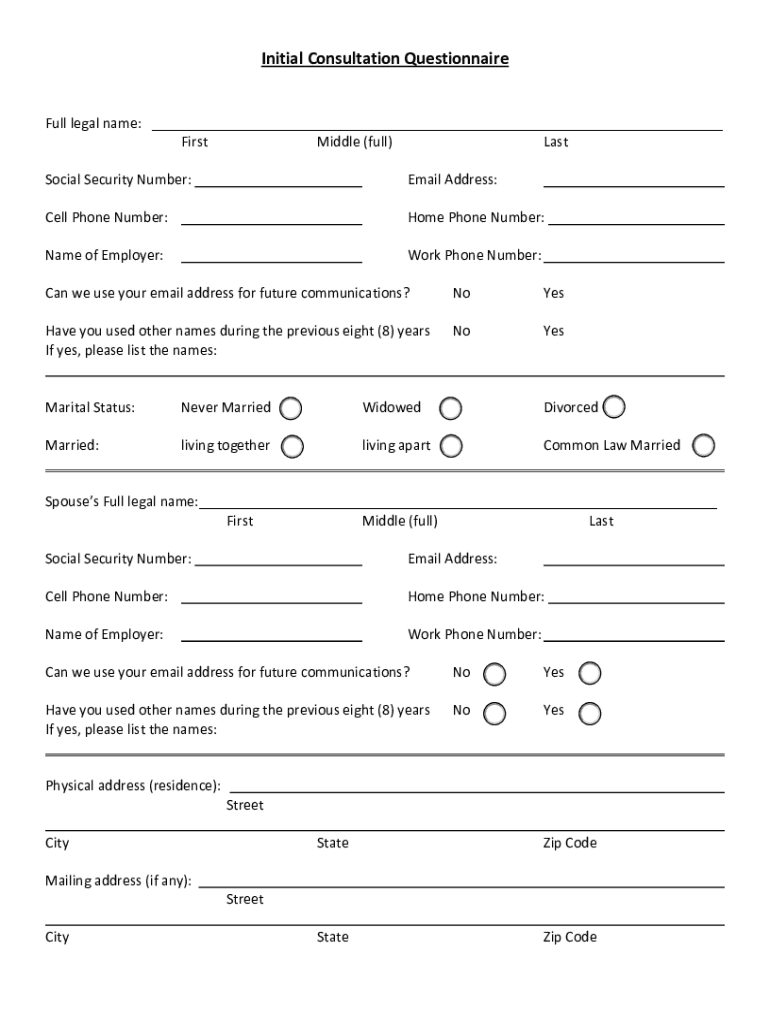InitialConsultationQuestionnaire Fulllegalname: First Middle(full) Last SocialSecurityNumber: Misaddress: CellPhoneNumber: HomePhoneNumber: NameofEmployer: WorkPhoneNumber: Canweuseyouremailaddressforfuturecommunications?