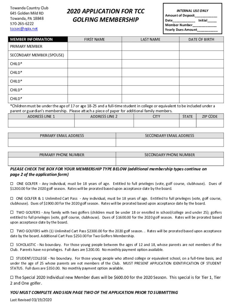 Towards Country Club 645 Golden Mild RD Towards, PA 18848 5702656222 COSEC epic.net2020 APPLICATION FOR TCC GOLFING MEMBERSHIPMEMBER INFORMATIONFIRST NAMEINTERNAL USE ONLY Amount of Deposit Date Initial