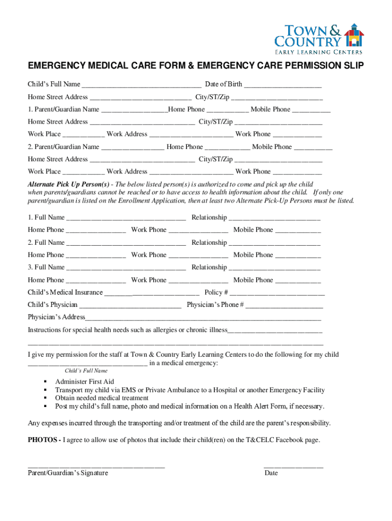 EMERGENCY MEDICAL CARE FORM & EMERGENCY CARE PERMISSION SLIP Child's Full Name Date of Birth Home Street Address City/ST/Zip 1. Parent/Guardian Name Home Phone Mobile Phone Home Street Address City/ST/Zip
