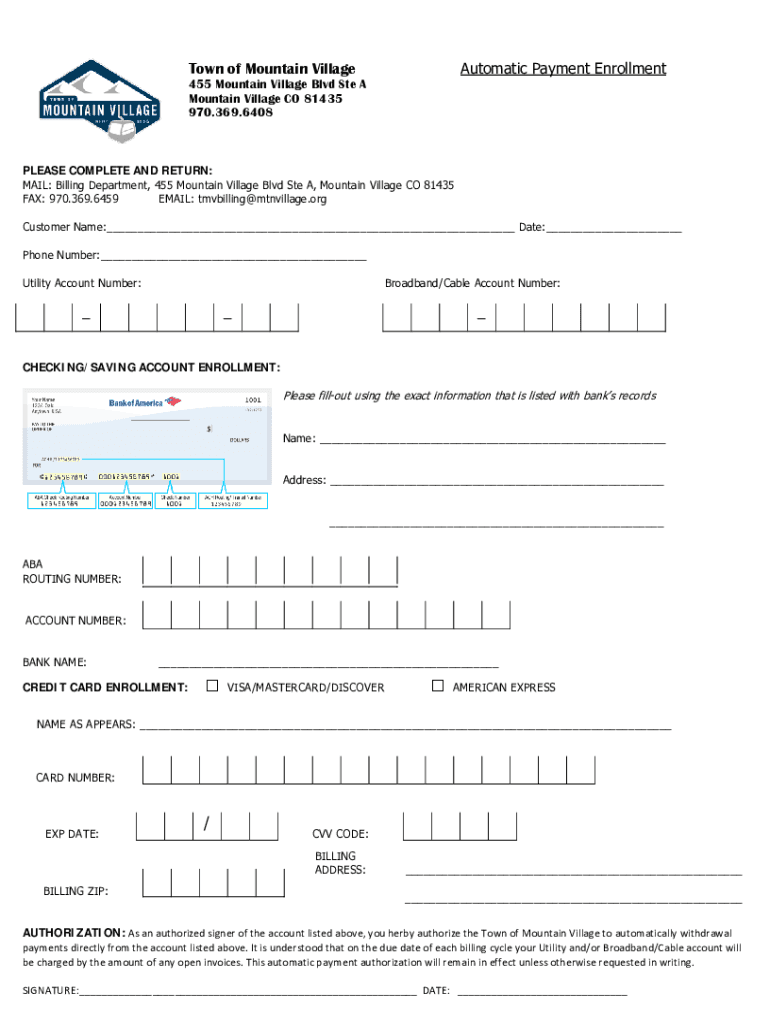 Automatic Payment EnrollmentTown of Mountain Village455 Mountain Village Blvd Ste A Mountain Village CO 81435 970.369.6408PLEASE COMPLETE AND RETURN: MAIL: Billing Department, 455 Mountain Village