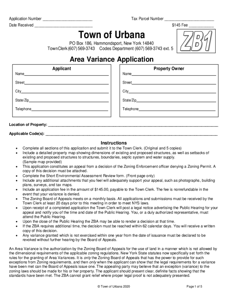 Application Number Tax Parcel Number Date Received $145 Fee Town of Urbana PO Box 186, Hammond sport, New York 14840 Town Clerk (607) 5693743 Codes Department (607) 5693743 ext. 5Area Variance Application