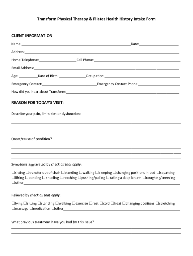 Transform Physical Therapy & Pilates Health History Intake Formalin INFORMATION Name: Date: Address: Home Telephone: Cell Phone: Email Address: Age: Date of Birth: Occupation: Emergency Contact: Emergency