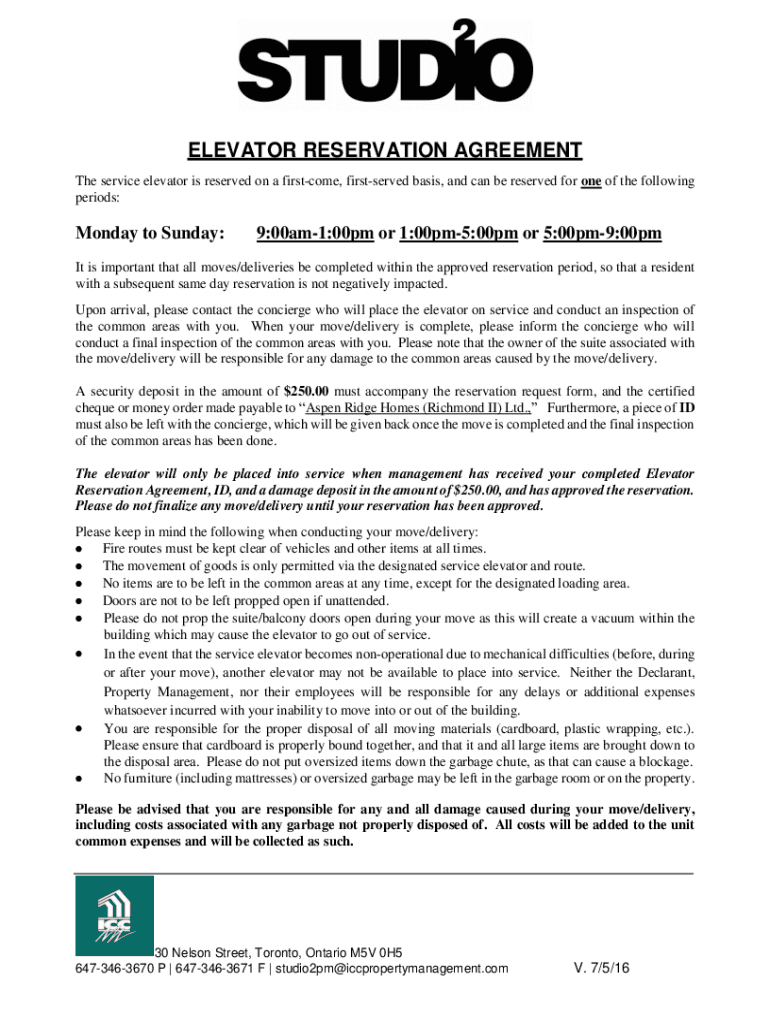 The service elevator is reserved on a first come, first served basis, and can be reserved for one of the following
