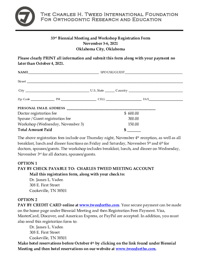The Charles H. Tweed International Foundation For Orthodontic Research and Education33rd Biennial Meeting and Workshop Registration Form November 36, 2021, Oklahoma City, Oklahoma Please clearly PRINT