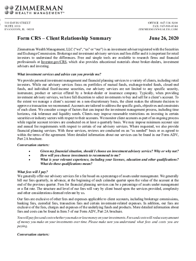 Get the free Zimmerman Wealth Management - Form CRS(37273437.2).docx