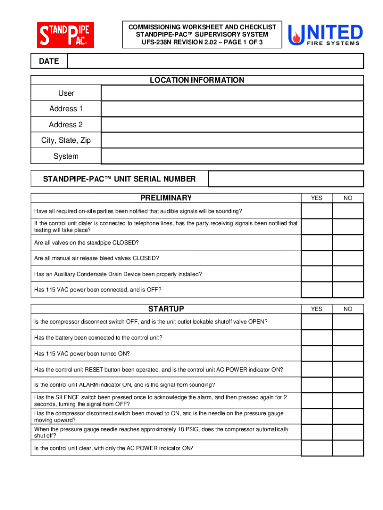 COMMISSIONING WORKSHEET AND CHECKLIST STANDPIPE PAC SUPERVISORY SYSTEM UFS238N REVISION 2.02 PAGE 1 OF 3DATE LOCATION INFORMATION User Address 1 Address 2 City, State, Zip System STANDPIPE PAC UNIT