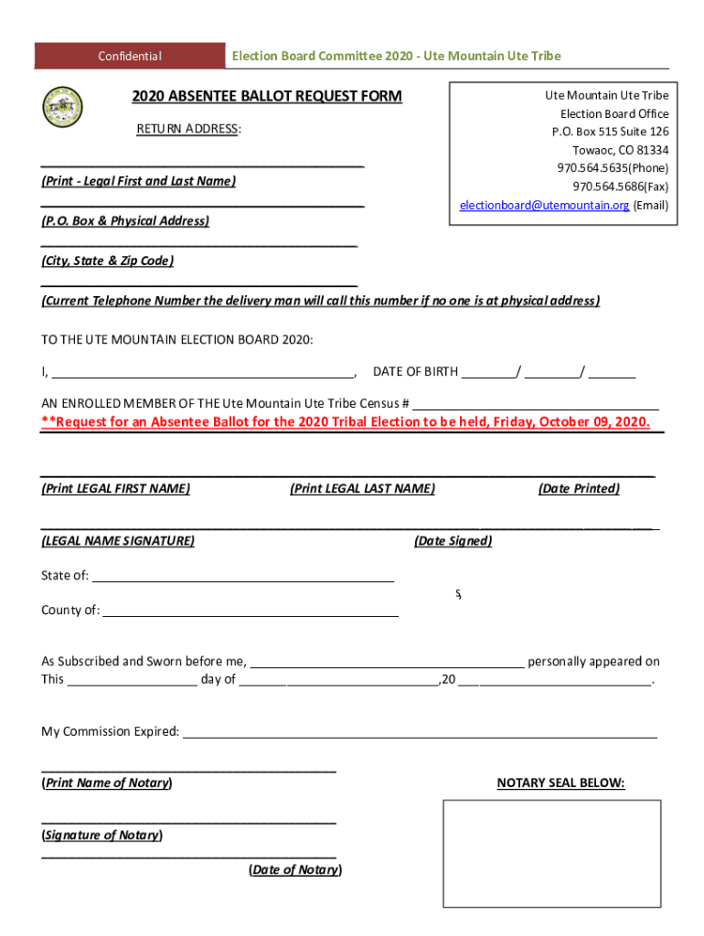 ConfidentialElection Board Committee 2020 Ute Mountain Ute Tribe2020 ABSENTEE BALLOT REQUEST FORM RETURN ADDRESS:Ute Mountain Ute Tribe Election Board Office P.O. Box 515 Suite 126 Toward, CO 81334