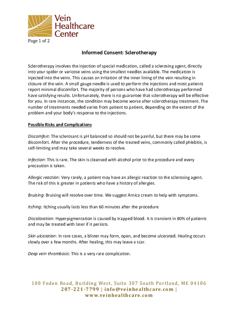 Page 1 of 2Informed Consent: SclerotherapySclerotherapy involves the injection of special medication, called a sclerosis agent, directly into your spider or varicose veins using the smallest needles available. The medication is