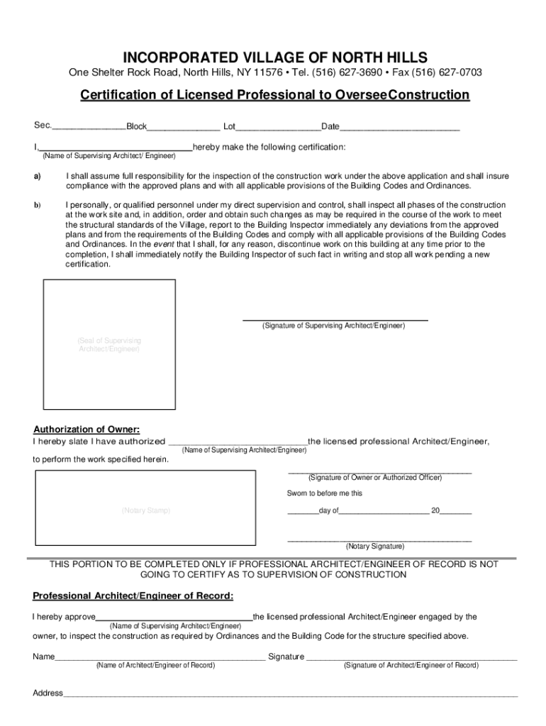 INCORPORATED VILLAGE OF NORTH HILLS One Shelter Rock Road, North Hills, NY 11576 Tel. (516) 6273690 Fax (516) 6270703Certification of Licensed Professional to Oversee Construction Sec. Block Lot Date