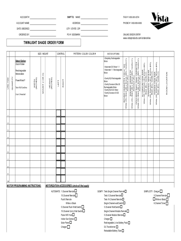 SHIP TO: NAME:ONLINE ORDER ENTRYwww.vistaproducts.com/orderonlineTWINLIGHT SHADE ORDER WORKROOM LOCATIONHIDDEN HEM BAR White (W), Aluminum (AL), Bronze (BR), Black (BL), Vanilla (V)The RIGHTEST Comfy