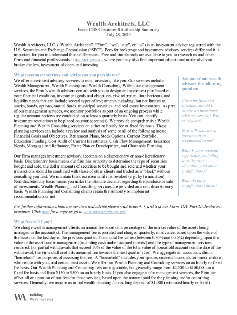 Wealth Architects, LLC. (Wealth Architects, Firm, we, our, or us) is an investment adviser registered with the
