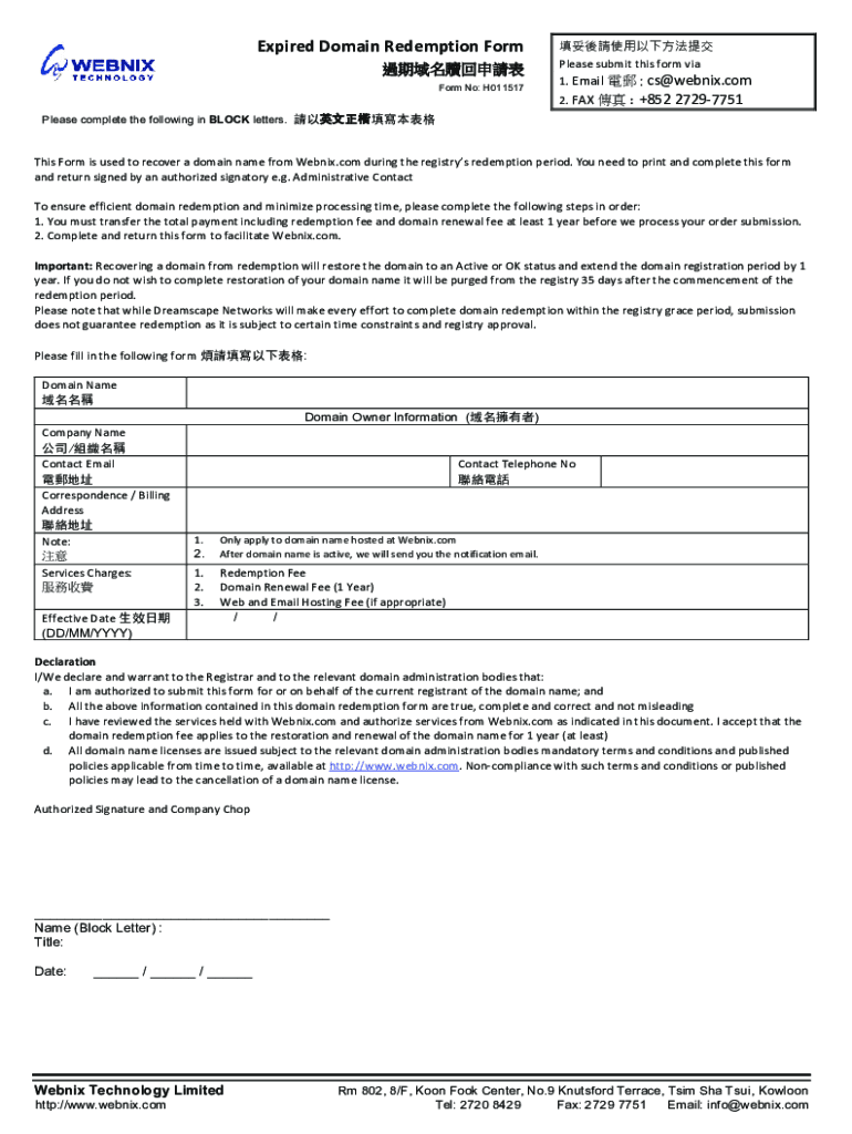 Expired Domain Redemption Form No: H011517 Please submit this form via 1. Email : cs webnix.com 2. FAX :+852 27297751Please complete the following in BLOCK letters. This Form is used to recover a
